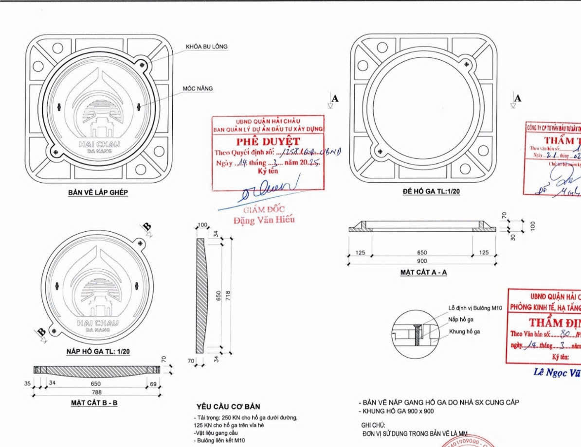 Sản phẩm Nắp hố ga KT khung 900x900x100, nắp D700mm, tải trọng 25 tấn được sản xuất theo bản vẽ yêu cầu của đối tác phục vụ Gói thầu: Xây lắp thuộc dự án: Nâng cấp, cải tạo đường Mai Lão Bạng và đường Châu Văn Liêm